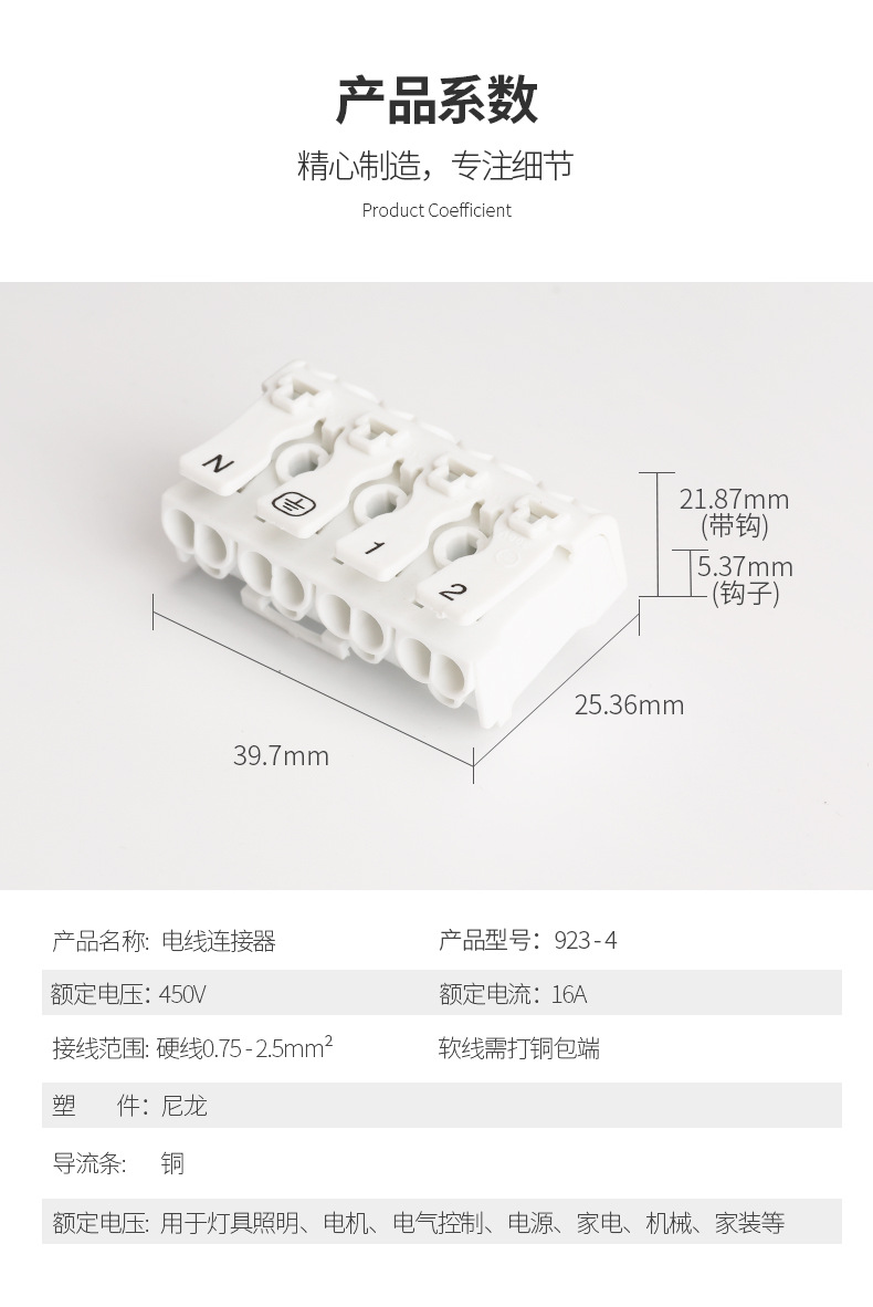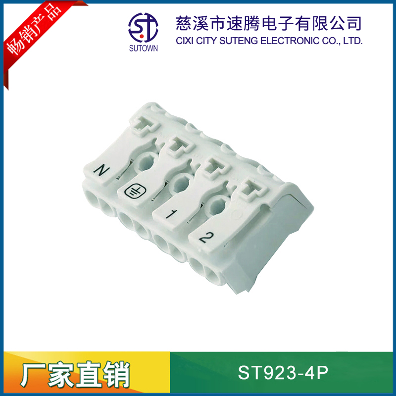 Product name:923 terminal block 4P Product model:ST923-4P Apply to wire:Hard and soft conductor 0.75-2.5mm^2 Technical parameter:Rated voltage:400V Rated current:24A Product size:40*,25*,21mm(Depth,width,hight) Product materials:Crust:Modifled nylonPA66 The diversion of article:Electrolysis copper (surface of the tin) Spring:301 Stainless steel